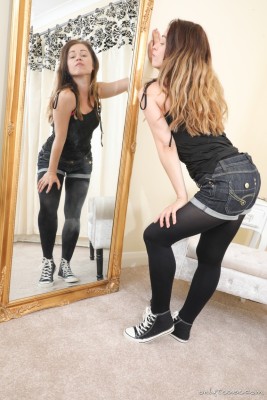 Thanks for stopping by OnlyTeaseFan and for your viewing pleasure I have a brand new gallery of Amy D, a model I haven’t featured here before on the site. She is looking quite cute and adorable as she poses for us in jean shorts with sneakers and black opaque pantyhose. Amy shows off those brilliant legs before removing her top and posing in a pink bra. This cutie removes her shorts before her bra, finishing topless and admiring her lovely tits in the mirror while wearing only her tights. Would you like to see more of this beautiful babe and other hot models in sexy outfits and nylons? Click HERE for instant access to OnlyTease today!
