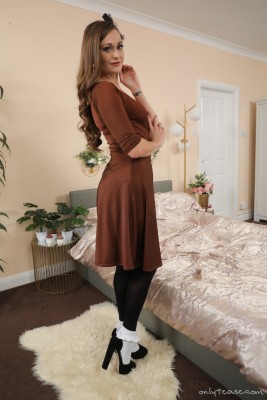 Here’s another free gallery of hot OnlyTease babe Honour May for you to check out. She is wearing a sexy brown dress with a pair of high heels and white ankle socks. Those amazing legs of hers are encased in black opaque stockings. You get to see the suspenders she is wearing underneath as well as the tiny black panties when Honour lays on the bed and spreads her legs for us. The first thing she removes as part of her striptease is those tiny panties. What a naughty girl! Her dress comes off next giving us a really nice view of those lovely tits. Want to see more of Honour May? Click HERE for instant access to all her updates at OnlyTease!
